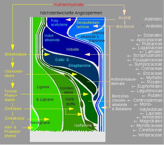 Verkürzung von Biosynthesewegen im Verlauf der Angiospermenevolution. Verteilung einiger biogenetischer Gruppen von sekundären Pflanzenstoffen mit allelochemischer Wirkung bei den Angiospermen. Das Schema zeigt, daß Derivate des Shikimat-Weges (in Grüntönen dargestellt) zunehmend von solchen des Mevalonat- und Acetat-Weges (in Blautönen dargestellt) ersetzt werden: Entstehung krautiger Formen. Die Beteiligung von Acetat bei kondensierten Gerbstoffen und Isoflavonen ist nicht berücksichtigt. Die angegebenen Familien und Ordnungen sind Beispiele für die jeweiligen Konstellationen von Pflanzenstoffen. Ein lineares Abstammungsverhältnis zwischen ihnen wird nicht angenommen (Nach K. KUBITZKI und O. R. GOTTLIEB, 1984).