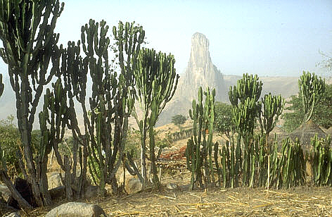 Sukkulente Arten: Aquqrell aus A. KERNER v. MARILAUN "Pflanzenleben" Wie in Mexiko aus Kakteen, gibt es in Afrika Zäune aus Euphorbien (in Rumsiki, im Norden Kameruns).