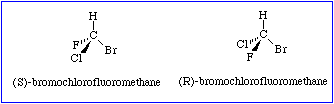 Thus the enantiomer shown on the left of Figure 1 is called (S)-bromochlorofluoromethane, while the one on the right is called (R)-bromochlorofluoromethane.