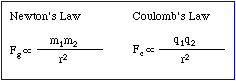 It is instructive to compare the form of the mathematical expressions of Newton's Law for the gravitational attraction between two planetary bodies and Coulomb's Law for the electrostatic attraction between two charged particles. Figure 2 presents these expressions side-by-side.