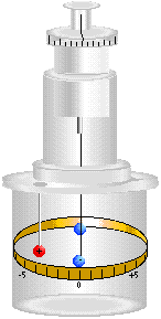 Coulomb measured the interaction between electrostatically charged pith balls. As the animation indicates, the oppositely charged pith balls are attracted to each other. As the balls suspended from the thin fiber rotate toward the one attached to a glass rod, Coulomb was able to measure the torsion on the fiber with the scale near the top of the device and the distance between the balls on the scale that circumscribed the jar. He was able to derive a mathematical equation that described the relationship between these two variables.