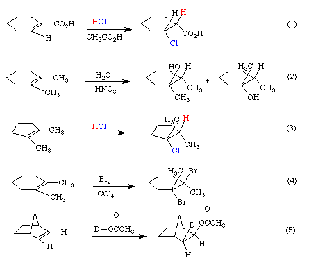 It should be clear that the stereochemical situation is muddy. In reactions 1 and 3 the elements of HCl add to opposite sides of the double bond. This is called anti addition. The stereochemistry of reaction 4 is also anti. In reaction 5 the elements of deuterated acetic acid add to the same side of the double bond in what is referred to as syn addition. Finally, reaction 2 proceeds with both syn and anti addition of the elements of water. The job of the organic chemist is to rationalize these results.
