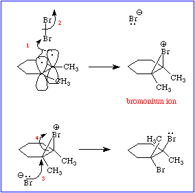 This rationale invokes a steric argument as well. In the step labeled 1 the pi electrons of the double bond act as a nucleophile displacing a bromide ion from the dibromine (2). Since a bromine atom is so large, it can simultaneously bond to both p orbitals, forming a bromonium ion. Note that in this ion the bromine is divalent and carries a formal positive charge. In the step labeled 3 the bromide ion effects a nucleophilic substitution on a carbon, displacing the bromine (4) and producing the final product. The bulk of the bromine atom in the bromonium ion forces step 3 to occur anti to step 1.