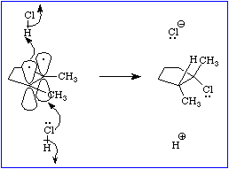 Even though only one molecule of HCl is consumed for each molecule of 1,2-dimethylcyclopentene, two molecules are involved in the transition state. Note that this picture specifically avoids the postulate of a carbocationic intermediate. If a carbocation were formed, then you should expect a mixture of syn and anti addition as was the case in reaction 2.