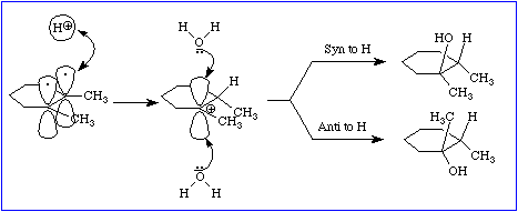 Perhaps the easiest result to rationalize is the most complicated, i.e. reaction 2. Figure 2 suggests how both syn and anti addition of water might occur.