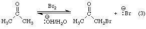 The disappearance of the red-orange color indicates that the dibromine has been consumed. The products of the reaction, a-bromoacetone and sodium bromide are colorless. The reaction involves nucleophilic attack of C-a of an enolate ion on a molecule of dibromine. See Figure 5.