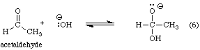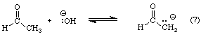 Given that the equilibrium constant for reaction 6 is approximately 104 times greater than that for reaction 7, how is it hydroxide ion prefers to act as a base rather than as a nucleophile? The answer is that it doesn't. Reaction 6 occurs in preference to reaction 7. In fact, for every time a hydroxide ion abstracts an a-hydrogen from one acetaldehyde molecule, 10,000 hydroxide ions add to the carbonyl groups of other acetaldehyde molecules. However, reaction 6 is readily reversible. Reaction 7, while reversible, may also proceed forward if the enolate ion reacts with an electrophile such as water, dibromine, diiodine, or chlorotrimethylsilane. It's sort of like the tortoise and the hare; reaction 6 gets off to a speedy start, but reaction 7 wins out in the end. Reaction 7 is the first step in an important carbon-carbon bond making process called the aldol reaction.