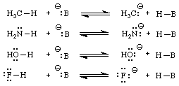 Hydrocarbons are among the weakest acids known. Conversely, their conjugate bases are some of the strongest bases there are. Why is it so hard to remove a proton from a carbon atom? The answer is because the conjugate base is very unstable. When an excess of electron density develops on a carbon atom, the nucleus of that atom cannot offer much Coulombic attraction to stabilize it. Consider the hypothetical acid-base reactions shown in Figure 1.