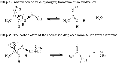 All of the lines of evidence described above may be rationalized by a process that involves the formation of an enolate ion. Figure 5 outlines the steps involved in the bromination of acetone.