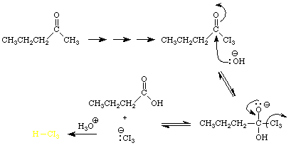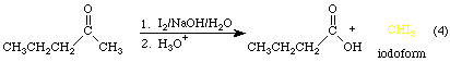 Given the chemistry described in Equation 3, it shouldn't be surprising that compounds which contain at least one hydrogen atom a to a carbonyl group also decolorize aqueous solutions of diiodine and sodium hydroxide. In the case of methyl ketones, the decoloration is accompanied by the formation of a molecule of iodoform, CHI3, a yellow solid. The decoloration of the solution and the formation of the yellow solid is taken as a positive result. Equation 4 illustrates the process for 2-pentanone. Note that the starting ketone is converted into a carboxylic acid that contains one fewer carbon atoms.