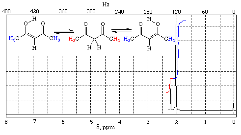 In molecules which contain hydrogen atoms that are a to two carbonyl groups, the enol tautomer may actually be the predominant form of the compound even in the absence of base. Figure 4 shows a partial 1H-NMR spectrum of 2,4-pentanedione. Integration of the signals for the methyl groups of the keto and enol forms of this compond reveals the relative amounts of each tautomer.