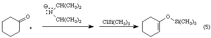 If a strongly basic solution of a ketone or aldehyde containing at least one a-hydrogen is "quenched" with chlorotrimethylsilane, it is possible to isolate a silyl enolether as shown in Equation 5.
