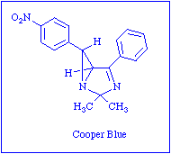 In 1965 an undergraduate student by the name of Cooper at Bucknell University was working on an independent project investigating the chemistry of aziridines, 3-membered rings in which one of the atoms is a nitrogen. Late one evening Mr. Cooper completed the preparation of a sample of 2-benzoyl-3-(4-nitropheny)aziridine, the starting material he needed for his project. Rumor has it that while cleaning some glassware, an errant spray of acetone from Mr. Cooper's squeeze bottle was misinterpreted by a nearby co-worker as an act of aggression. In the battle that ensued some acetone contaminated Mr. Cooper's reaction. As serendipity would have it, and as later investigation revealed, the accidental contamination led to the formation of a compound called 2,2-dimethyl-4-phenyl-6-(4-nitrophenyl)-1,3-diazabicyclo[3.1.0]hex-3-ene. Since no one wanted to be saying 2,2-dimethyl-4-phenyl-6-(4-nitrophenyl)-1,3-diazabicyclo[3.1.0]hex-3-ene all the time, and since the compound was bright blue, it quickly became known as Cooper Blue: