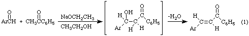 The first step in the synthesis involves the crossed aldol condensation of acetophenone with 4-nitrobenzaldehyde as shown in Equation 1 where Ar represents the 4-nitrophenyl ring. The product of reaction 1 is a trans-chalcone.