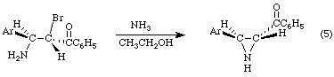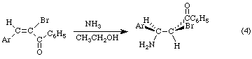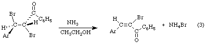 The initial reaction between the chalcone dibromide and ammonia is a 1,2-elimination of HBr. Ammonia acts as a base, deprotonating the carbon a to the carbonyl group. The mechanism of the reaction is most likely E2.