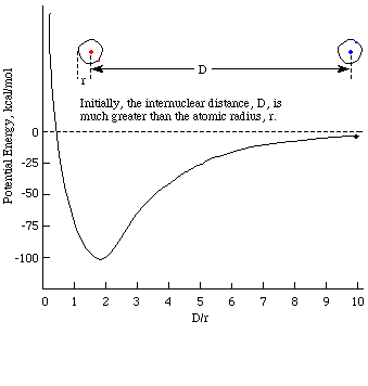 Why does the potential energy change in this manner? The rationalization that chemists have accepted is that as the two atoms approach each other, each nucleus exerts an attractive force not only on its own electron, but also on the the other atom's electron. In the case of two hydrogen atoms this reciprocal interaction reaches a maximum when the internuclear separation is 72 pm. The potential energy of the electrons in this arrangement is approximately 103 kcal/mol less than that of the electrons associated with the isolated hydrogen atoms. The mutual attraction of the two nuclei for the two electrons is what chemists call a chemical bond. The internuclear separation that corresponds to the energy minimum is called the bond length. The 103 kcal/mol required to separate the atoms from 74 pm to an infinite distance is called the bond strength.