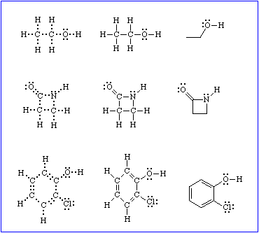 Drawing each bond in a molecule as two dots gets old very fast. To save time chemists usually depict a bond as a line drawn from one atomic symbol to another. Such representations are called Lewis structures rather than Lewis electron dot structures. Figure 5 shows Lewis structures for each of the molecules presented in Figures 1-4.