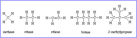 The name of the compound on the left in Figure 4 is butane. It is a colorless liquid with a boiling point of 0oC. It's what burns when you flick your BIC. Butane is a linear molecule; you can trace a path from the first to the fourth carbon atom without lifting your pencil from the paper.