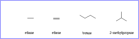 Generally organic chemists depict molecular structures using a convention known as bond line notation. According to this approach, a bond between two atoms is represented by a line. The ends of the line correspond to the positions of the bonded atoms. Only atoms other than carbon and hydrogen are shown explicitly. Thus the bond line notation for ethane is ___ . It is implied that there is a carbon atom at each end of the line. Furthermore, since the valence of carbon is four, it follows there are three hydrogen atoms connected to each carbon. Figure 6 illustrates the bond line notations for those compounds in Figure 5 that contain carbon-carbon bonds.