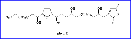 Finally, you will frequently encounter structural formulas that contain a mixture of bond line notation and condensed formulas. For example, a recent article in the Journal of Natural Products reported the isolation of a compound known as glacin B from the leaves of the pond-apple tree. Extracts of the leaves of this tree, which is native to Florida, have been used in traditional medicines as an insecticide and a parasiticide. The structure of glacin B is shown in Figure 8. Note the various conventions that are used in this depiction of the molecule.