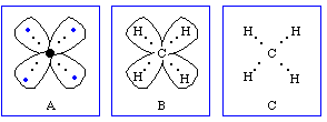 Figure 1 presents three alternative pictures of methane, starting with the depiction we saw during our discussion of valence bond theory. Representation B in Figure 1 labels the nuclei of the atoms with their atomic symbols. Drawing C shows just the atomic symbols and the shared pairs of electrons that constitute the four C-H covalent bonds. Drawing C is a Lewis electron dot structure for methane.