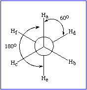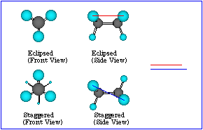 (N.B. You must have the Chem 3D plug-in installed to view this model. To rotate around the C-C bond, first position the molecule so that you can see both carbon atoms. Then shift-click the pointer on each atom. Position the cursor on any atom in the structure while holding down the control key, and click the mouse. A menu will appear: Select Movies, then select Spin Torsional Angles from the Movies sub-menu. The second atom that you selected will begin to spin relative to the first. You may stop the rotation temporarily by holding down the mouse on the green arrow at the bottom of the model window.)