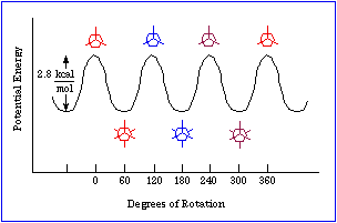 The eclipsed conformation has the highest potential energy, while the staggered conformation has the lowest. The difference between the two conformations is 2.8 kcal/mol. This represents a barrier to rotation about the C-C bond, but there is more than enough energy available at room temperature to overcome this barrier, so that the process is described as free rotation.