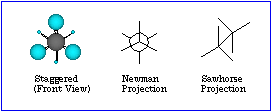 The views labeled staggered and eclipsed are called conformations. Figure 3 presents two alternative representations for the front view of the staggered conformation of ethane. These alternatives are self-explanatory.