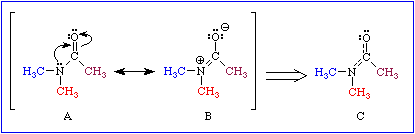 In our discussion of resonance theory, we learned that one of the structural features required for resonance involved a non-bonded pair of electrons adjacent to a pi bond. This situation occurs in amides, where the lone pair of electrons on the nitrogen atom interacts with the pi bond of the carbonyl group. This interaction is shown in Figure 2 for N,N-dimethylacetamide.