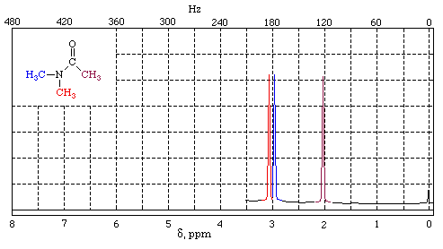 You don't have to know much about NMR to realize that the presence of three signals of equal intensity suggests that the three methyl groups in N,N-dimethylacetamide are different. If the formula in the inset represented the true structure of N,N-dimethylacetamide, you should expect free rotation around the sigma bond between the nitrogen atom and the carbonyl carbon. This rotation would make the two methyl groups attached to the nitrogen atom identical. In that case, the 1H-NMR spectrum of N,N-dimethylacetamide should contain two signals, one for the methyl group attached to the carbonyl carbon, and a second for the two methyl groups attached to the nitrogen. The intensity of the second signal should be twice that of the first. Clearly that is not the case. Something must be restricting the rotation around the C-N bond.