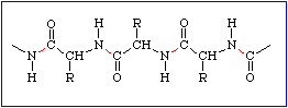 The restricted rotation observed in N,N-dimethylacetamide is characteristic of amides found proteins, i.e. polypeptides. Figure 3 presents a common representation of the "backbone" of a protein chain with the peptide bond shown in red. Notice how the N-H bond is always pointing in the opposite direction from the C-O double bond. This structural regularity is a direct result of restricted rotation about the peptide bond.