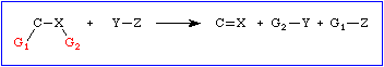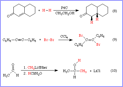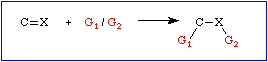 The implication of the notation G1/G2 is that the two atoms or groups that add to the multiple bond may be the elements of a single molecule as they are in reactions 8 and 9, or they may come from different molecules as they do in reaction 10. An organic chemist would say that Equation 10 described the addition of the "elements of" methane to the C-O double bond of acetaldehyde, the elements of methane being CH3 and H.