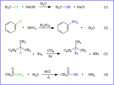 All substitution reactions result in the replacement of one atom or group by another. Figure 1 presents 4 specific examples of different types of substitution reactions. The bonds that are broken and formed during each reaction are shown in red. The atom or group that is displaced is highlighted in green, while the incoming atom or group is colored blue.