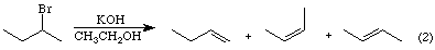 Many chemical reactions produce more than one product. For example, the 1,2-elimination of hydrogen bromide from 2-bromobutane yields a mixture of 1-butene and cis-and trans-2-butenes as shown in Equation 2.