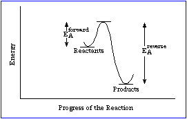 The difference in energy between the reactants and the point of maximum energy achieved during the reaction is called the activation energy. The point of maximum energy along the path from reactants to products is called a transition state. The heat from the match must raise the energy level of the reactants to the level of the transition state in order to get the fire started. Once it's going, the energy released as product is formed is available to activate other reactants. A reaction in which the products have less energy than the reactants is exothermic.
