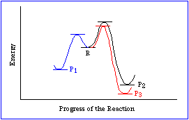 Figure 2 is a bit misleading since it implies that all the products have the same energy. That's not true. Each of the products in reaction 2, for example, has a different energy. Figure 2 also implies that there's only one path from reactants to products. That's not true either. The path from reactant to product is different for each product. Figure 3 presents a more complete reaction coordinate diagram for this reaction.