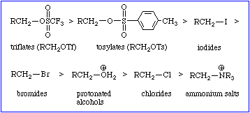 We have seen how chemical kinetics allows chemists to evaluate the impact that changing the substituents attached to the reaction center has on the rates of Sn2 reactions. We have also seen how the rates of bimolecular nucleophilic aliphatic substitution reactions change when the nucleophile is changed. Now we will take a brief look at the role of the leaving group in this process.