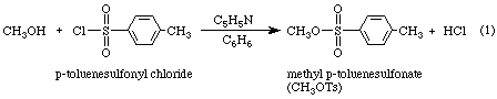 This is actually a nucleophilic substitution reaction in which methanol acts as the nucleophile displacing chlorine from the sulfur of the p-toluenesulfonyl chloride. Pyridine, C5H5N, acts as an acid trap, reacting with the HCl that is formed. The resulting salt, pryidine hydrochloride, C5H5N.HCl, is insoluble in the solvent, benzene. Its precipitation from the mixture insures complete conversion of the alcohol to the tosylate.
