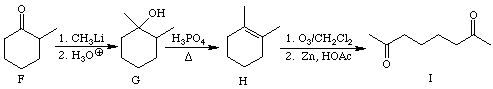 27. Consider the following reaction sequence:The 13C-NMR spectra of compounds F and I are shown below. Draw the structure of compound F.