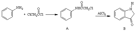 The following reaction sequence relates to questions 10 and 11: A = ClC(=O)CNc1ccccc1; B = O=C1CNc2ccccc12