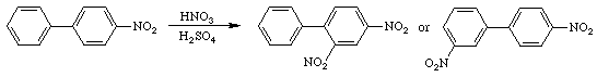 [O-][N+](=O)c1ccc(c2ccccc2)c(c1)[N+](=O)[O-] This is a tricky question. It deals with the effects of substitutent groups on both the rate and the orientation in electrophilic aromatic substitution reactions. First let's deal with the rate. The right hand ring contains two substituents, a strongly deactivating nitro group and a weakly activating phenyl ring. It should react more slowly than benzene. The left hand ring contains one substituent, the nitro phenyl ring. This is a deactivting group, and this ring should also react more slowly than benzene. Since there's no direct way to compare these effects, either of the two structures shown above is acceptable. In the first structure the orientation of the incoming nitro group is ortho to the phenyl ring and meta to the nitro group as expected. In the second structure the nitro group is meta to the deactivating, meta-directing, nitrophenyl substituent.
