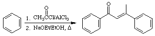 5. CC(=CC(=O)c1ccccc1)c2ccccc2 The first reaction is a Friedel-Crafts acylation. The