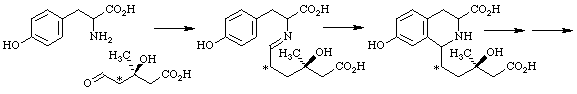 Enter the number of the carbon atom in lophocerine that contains the isotopic label. C3 The initial reaction is the formation of an imine by nucleophilic addition of the amino group to the aldehyde. This is the most likely possibility. Ring closure, which is actually an example of an electrophilic aromatic substitution reaction, then follows. Dehydration and decarboxylation